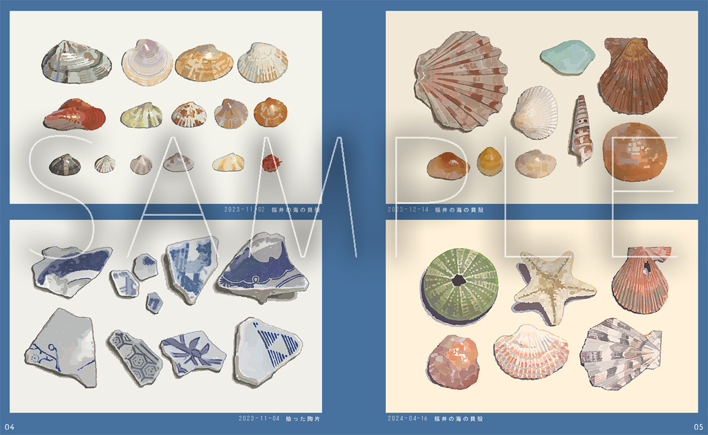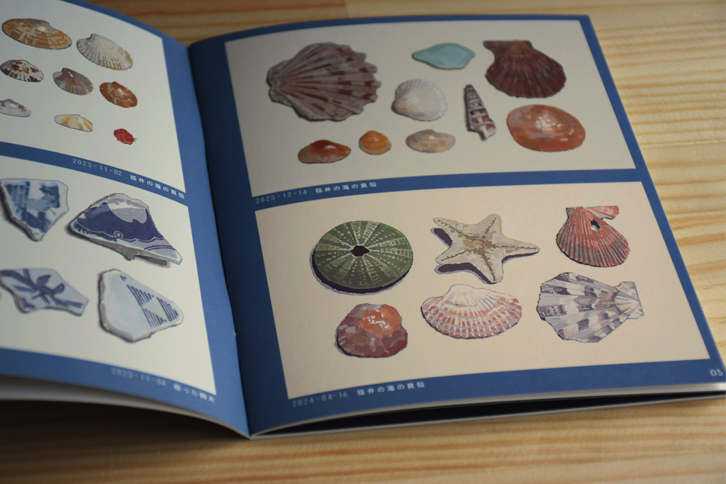 海(や貝殻や石)の絵をまとめた本です。